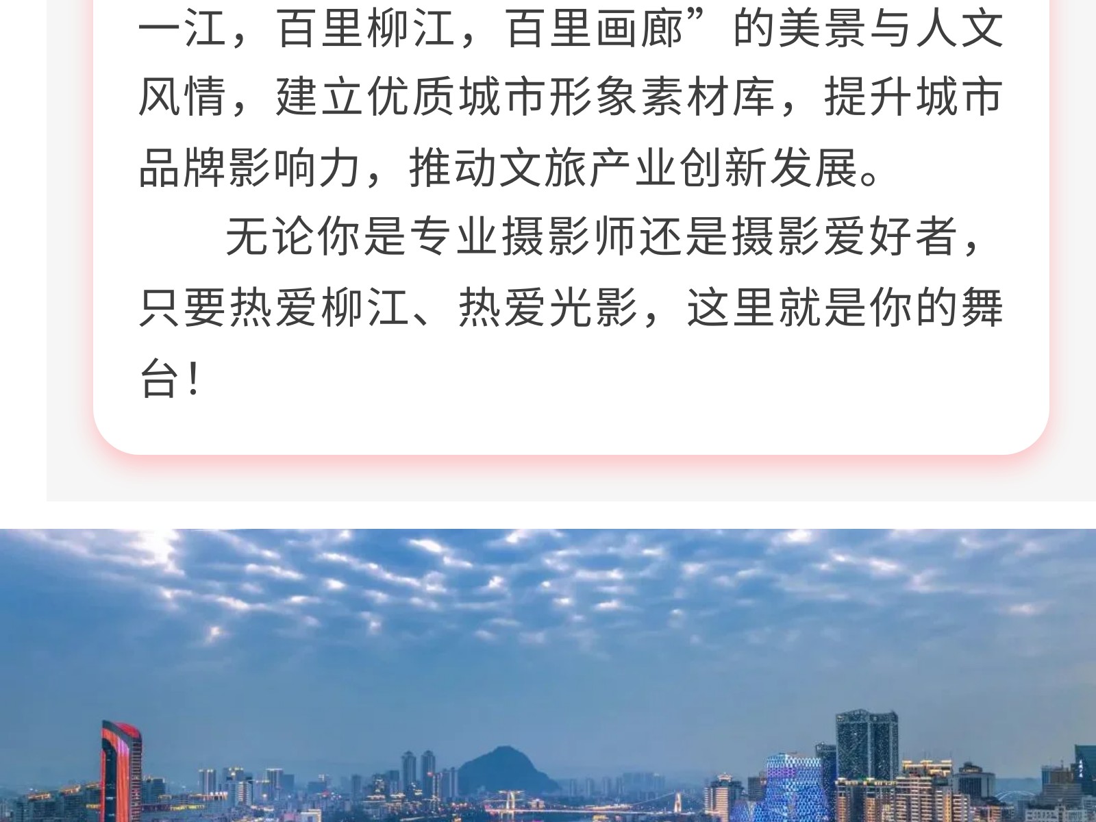 定格最美柳江!首屆“百里柳江”攝影大賽火熱征集中,邀你共賞百里畫(huà)廊! 發(fā)布時(shí)間:2025年04月26日 16時(shí)來(lái)源:本站原創(chuàng )瀏覽:161 人次