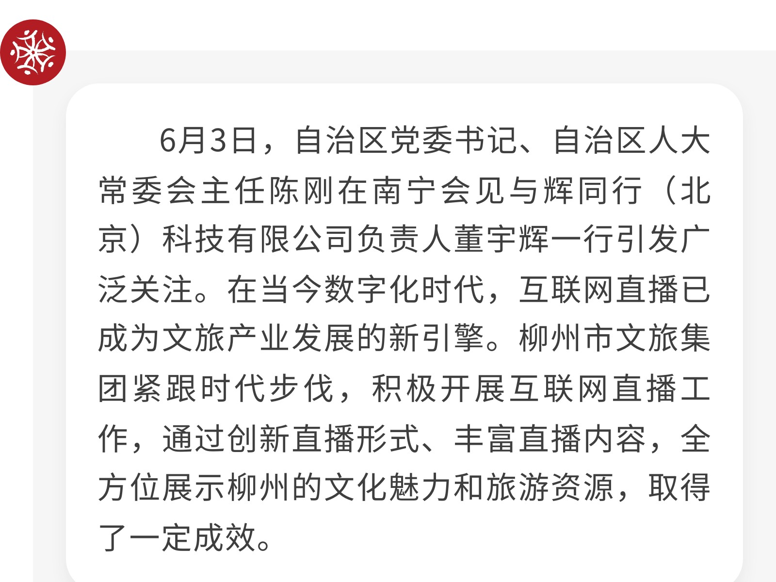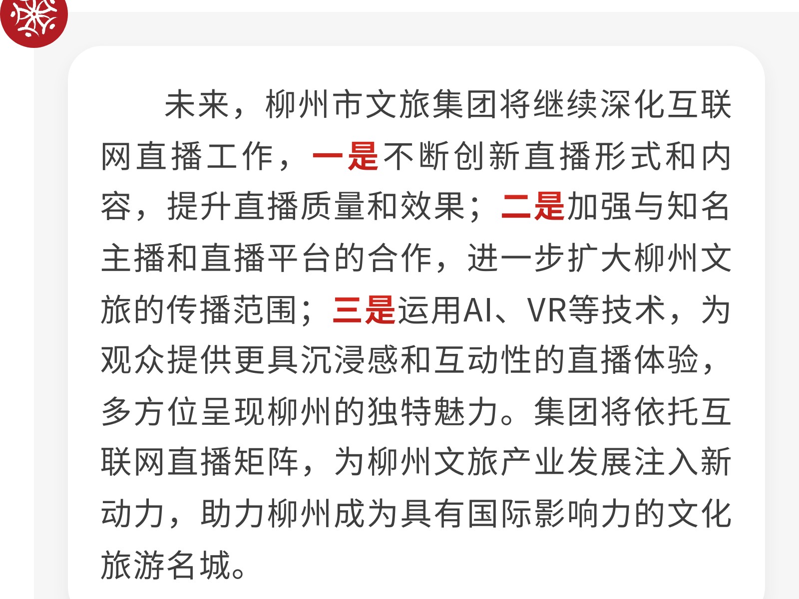 柳州市文旅集團積極探索互聯(lián)網(wǎng)直播矩陣,助力城市文旅新發(fā)展 發(fā)布時(shí)間:2025年06月12日 20時(shí)來(lái)源:本站原創(chuàng )瀏覽:108 人次
