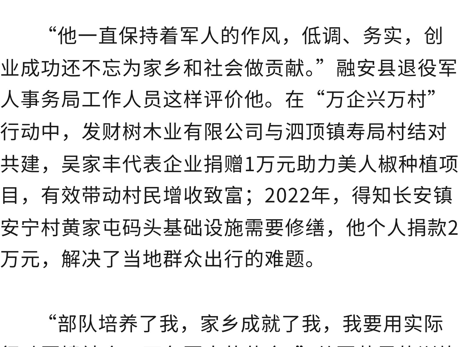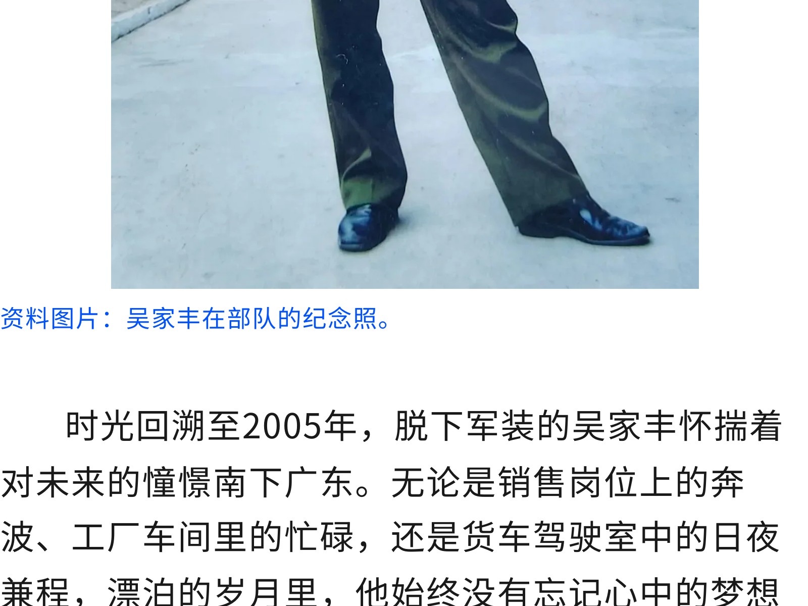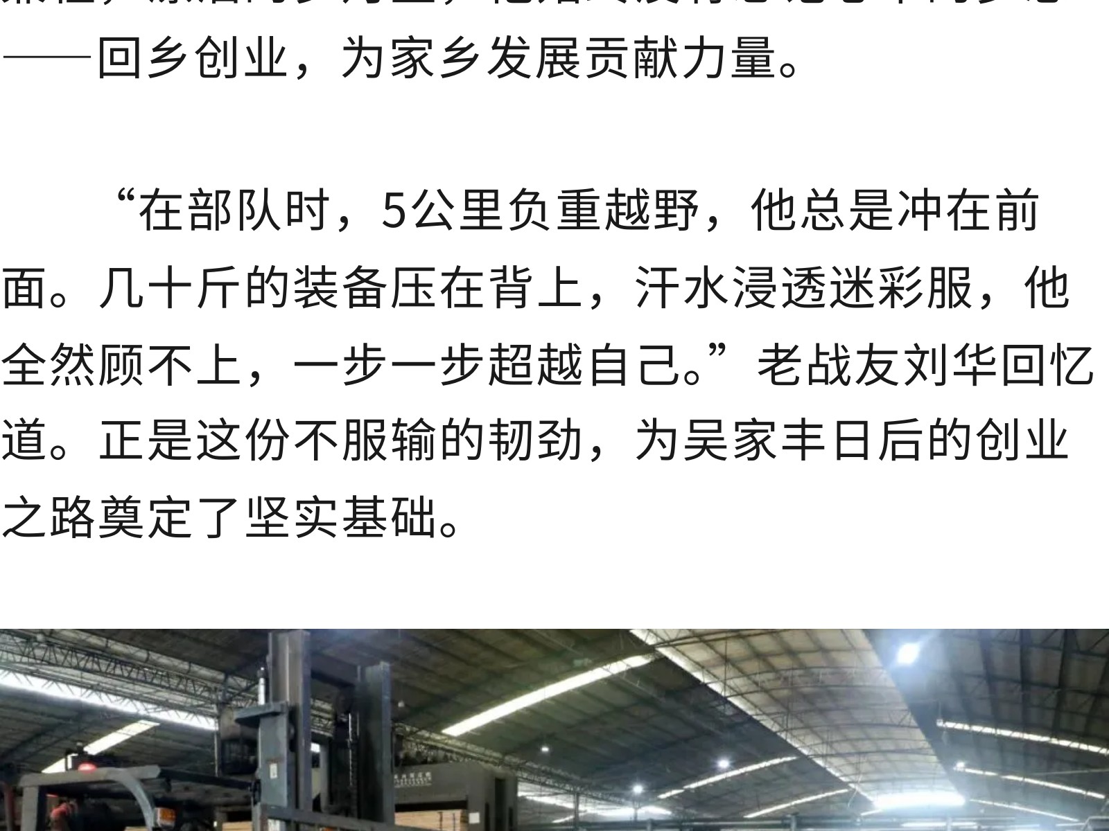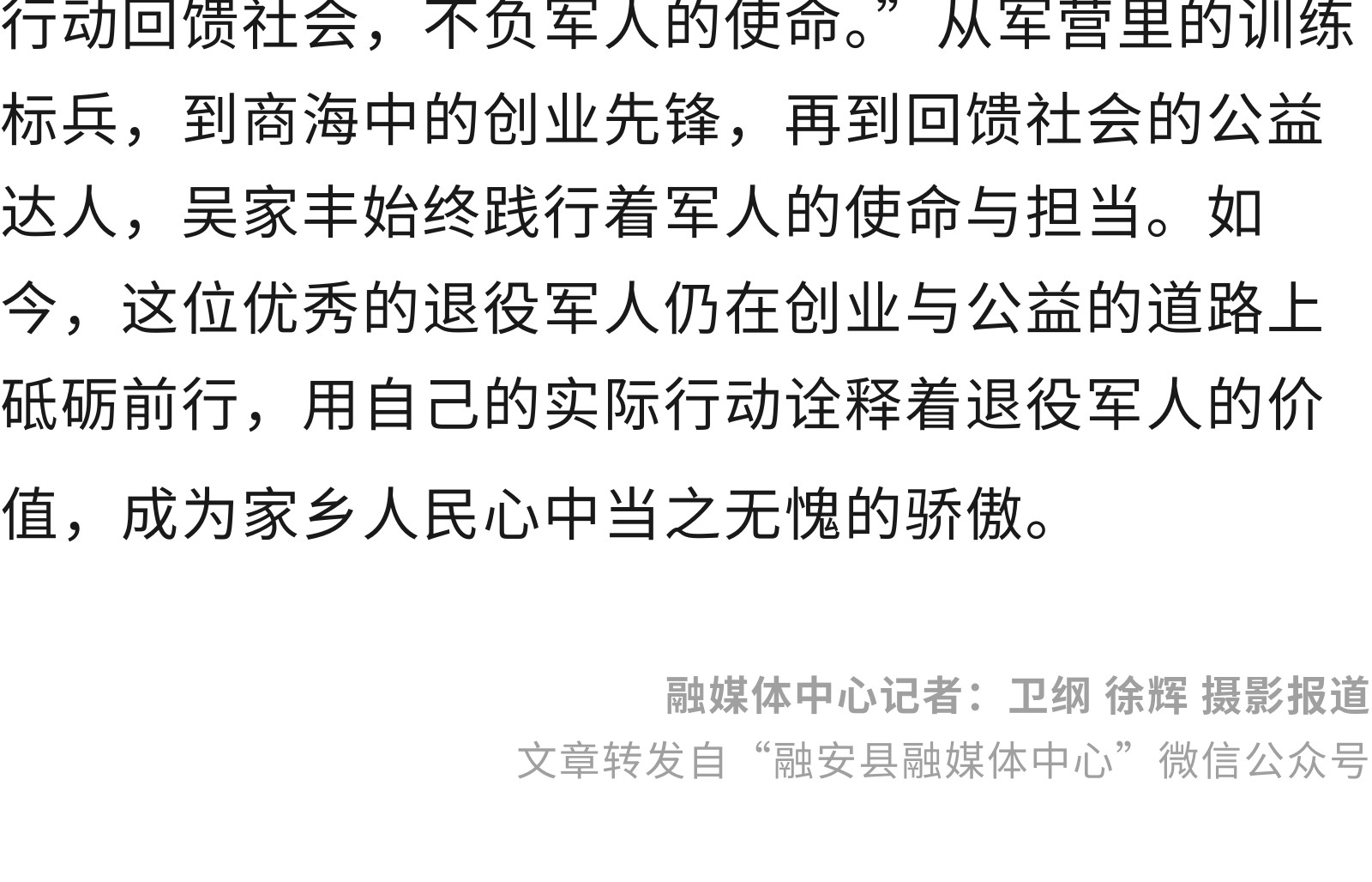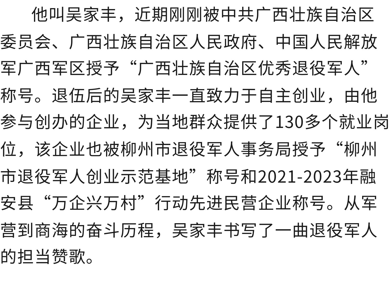 【最美退役軍人】從軍營(yíng)硬漢到創(chuàng )業(yè)先鋒——記廣西優(yōu)秀退役軍人吳家豐 發(fā)布時(shí)間:2025年09月19日 09時(shí)來(lái)源:本站原創(chuàng )瀏覽:56 人次