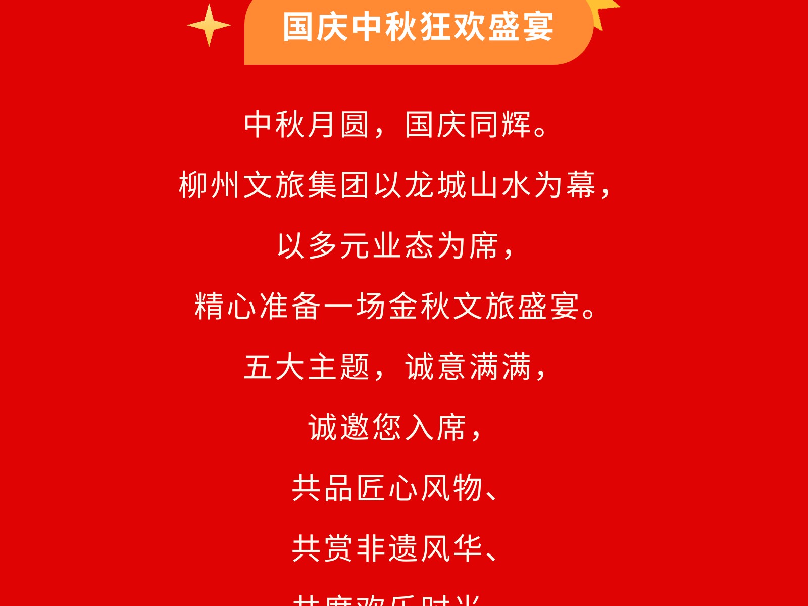 【雙節同慶,盛情以待】柳州文旅集團邀您共赴一場(chǎng)金秋文旅盛宴 發(fā)布時(shí)間:2025年09月30日 16時(shí)來(lái)源:本站原創(chuàng )瀏覽:76 人次