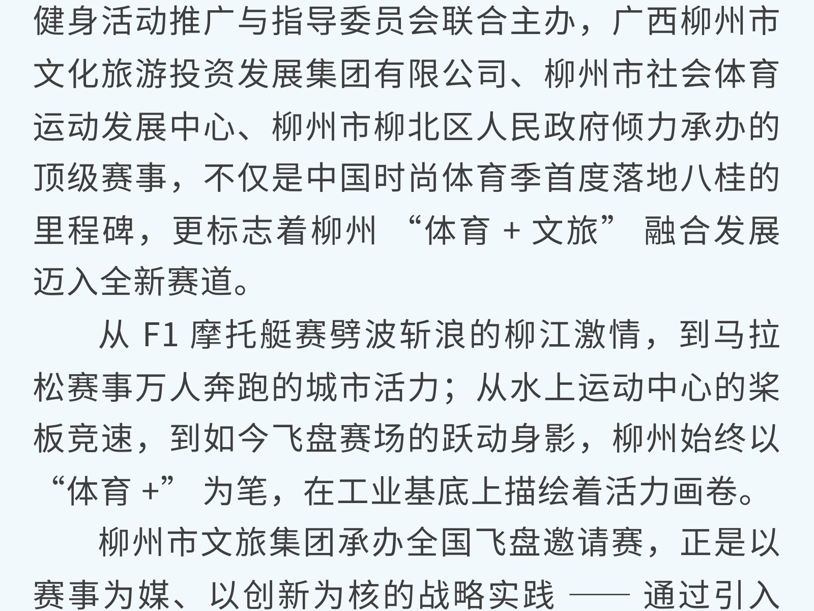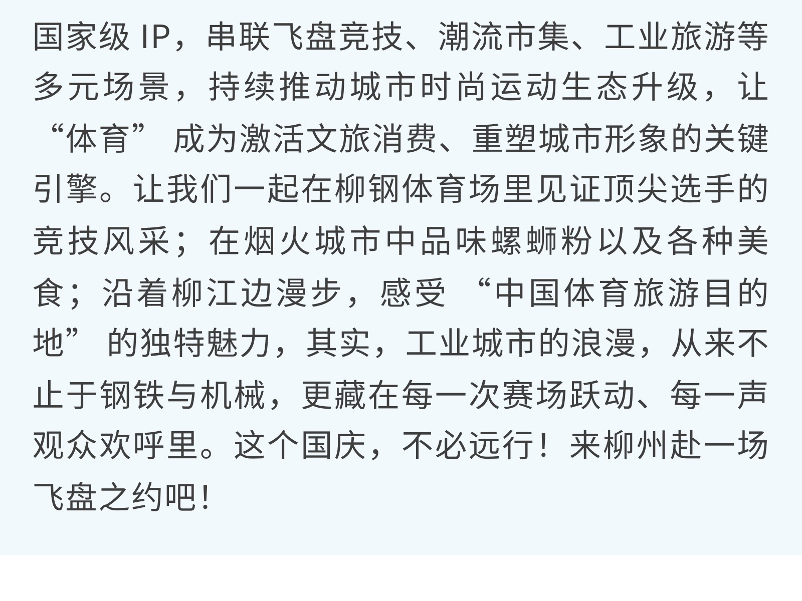 國(guó)慶赴柳!鋼鐵賽場(chǎng)飛盤燃,柳州這座體育旅游之城藏不住了 發(fā)布時(shí)間:2025年10月02日 17時(shí)來源:本站原創(chuàng)瀏覽:49 人次