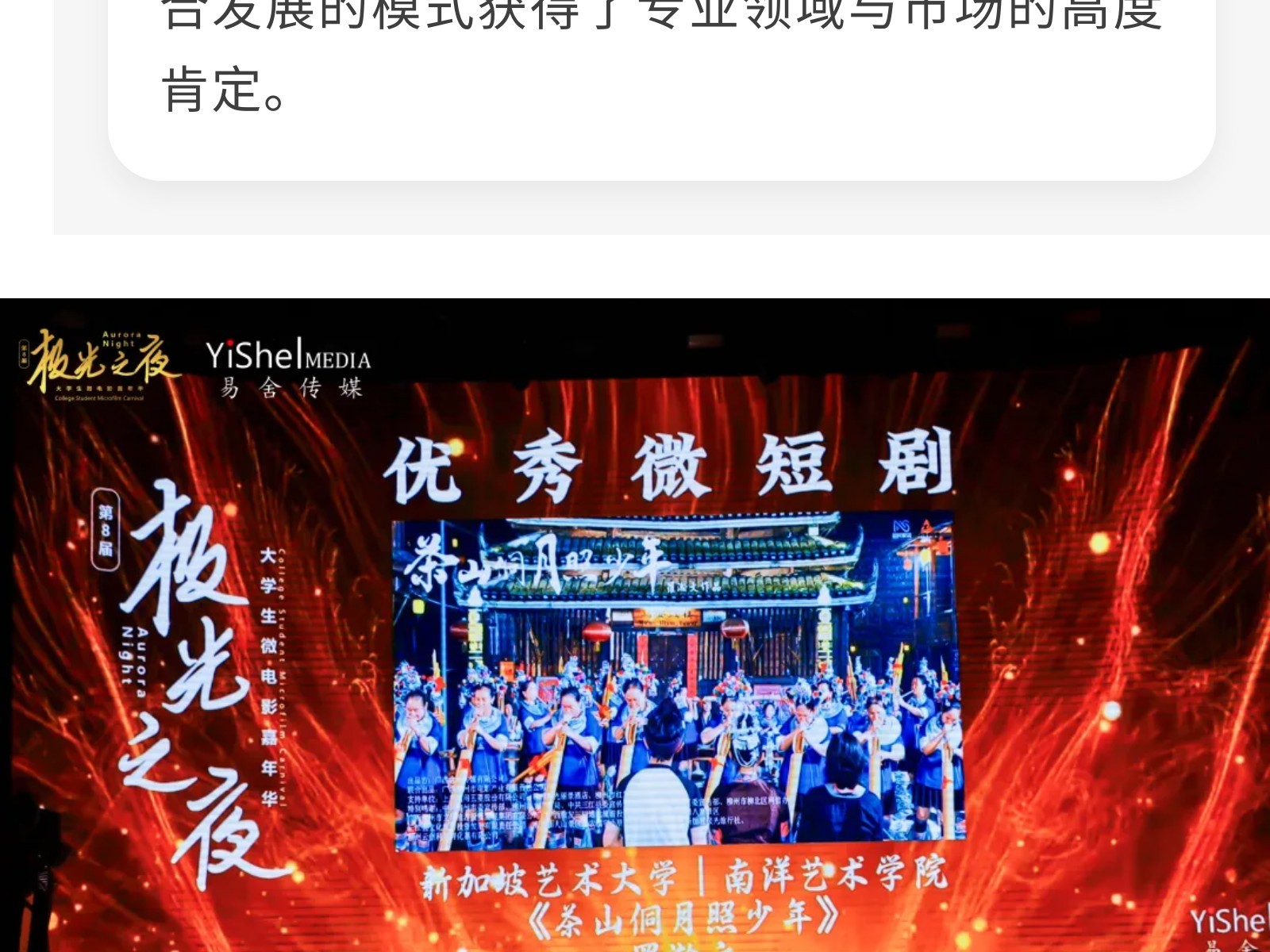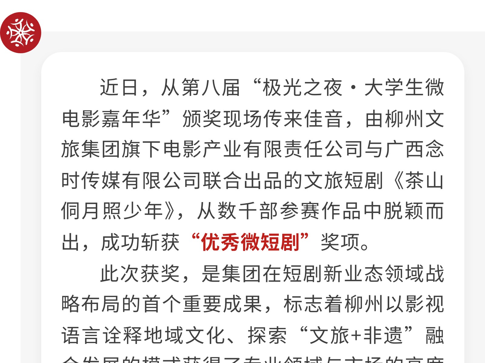 捷報(bào)!文旅集團(tuán)電影公司出品短劇榮膺“極光之夜”優(yōu)秀微短劇獎(jiǎng) 發(fā)布時(shí)間:2025年10月21日 10時(shí)來源:本站原創(chuàng)瀏覽:32 人次