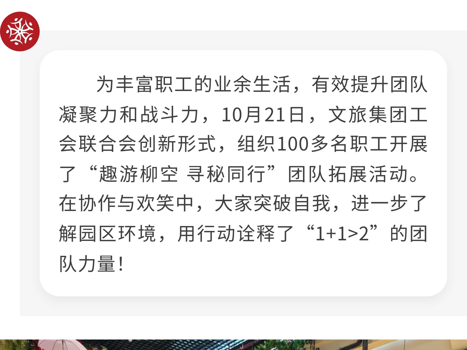 趣游柳空,尋秘同行!文旅集團開(kāi)展團隊拓展活動(dòng),玩出滿(mǎn)滿(mǎn)凝聚力 發(fā)布時(shí)間:2025年10月23日 10時(shí)來(lái)源:本站原創(chuàng )瀏覽:36 人次