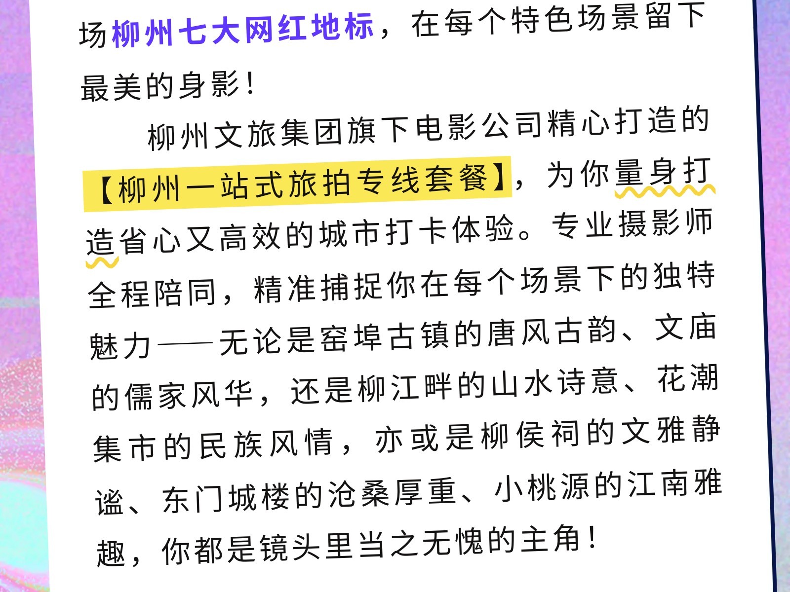 文旅集團電影公司創(chuàng )新打造獨家旅拍專(zhuān)線(xiàn)!穿越柳州絕美打卡點(diǎn),定制你的專(zhuān)屬城市旅行大片! 發(fā)布時(shí)間:2025年11月05日 10時(shí)來(lái)源:本站原創(chuàng )瀏覽:47 人次