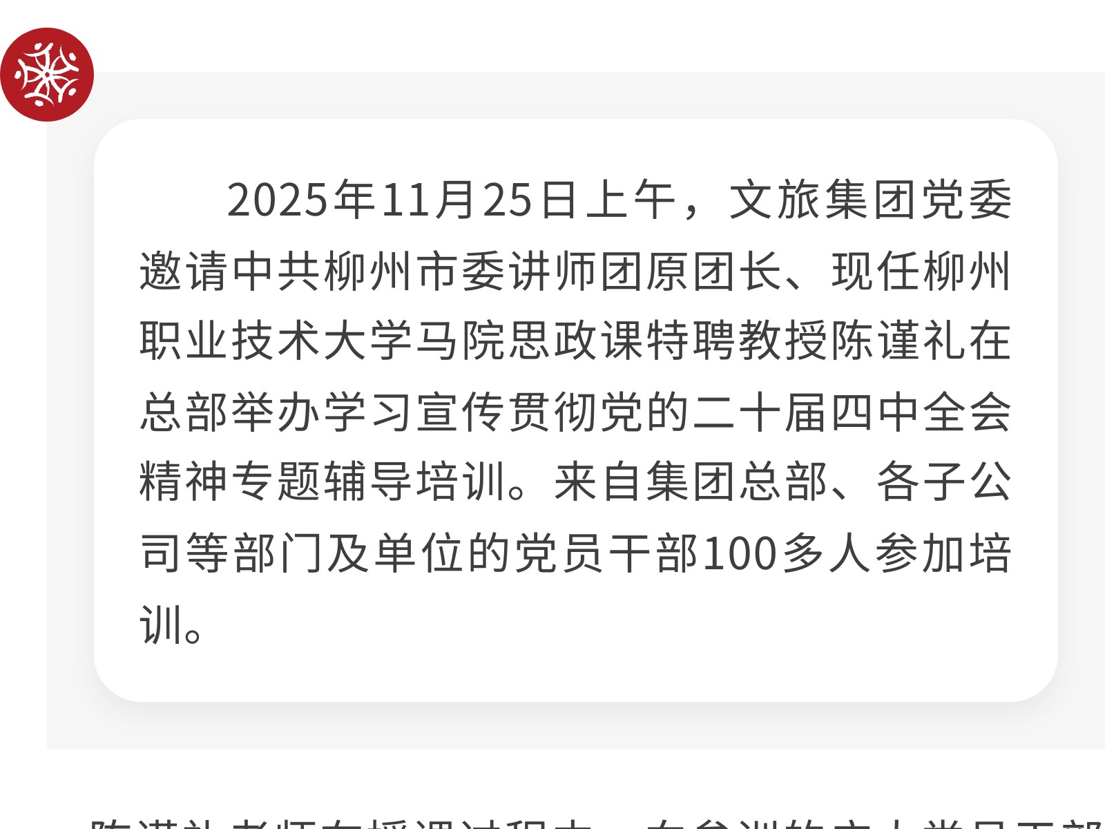 【文旅講堂】文旅集團黨委開展學習宣傳貫徹黨的二十屆四中全會精神專題輔導培訓 發(fā)布時間:2025年11月25日 16時來源:本站原創(chuàng)瀏覽:20 人次