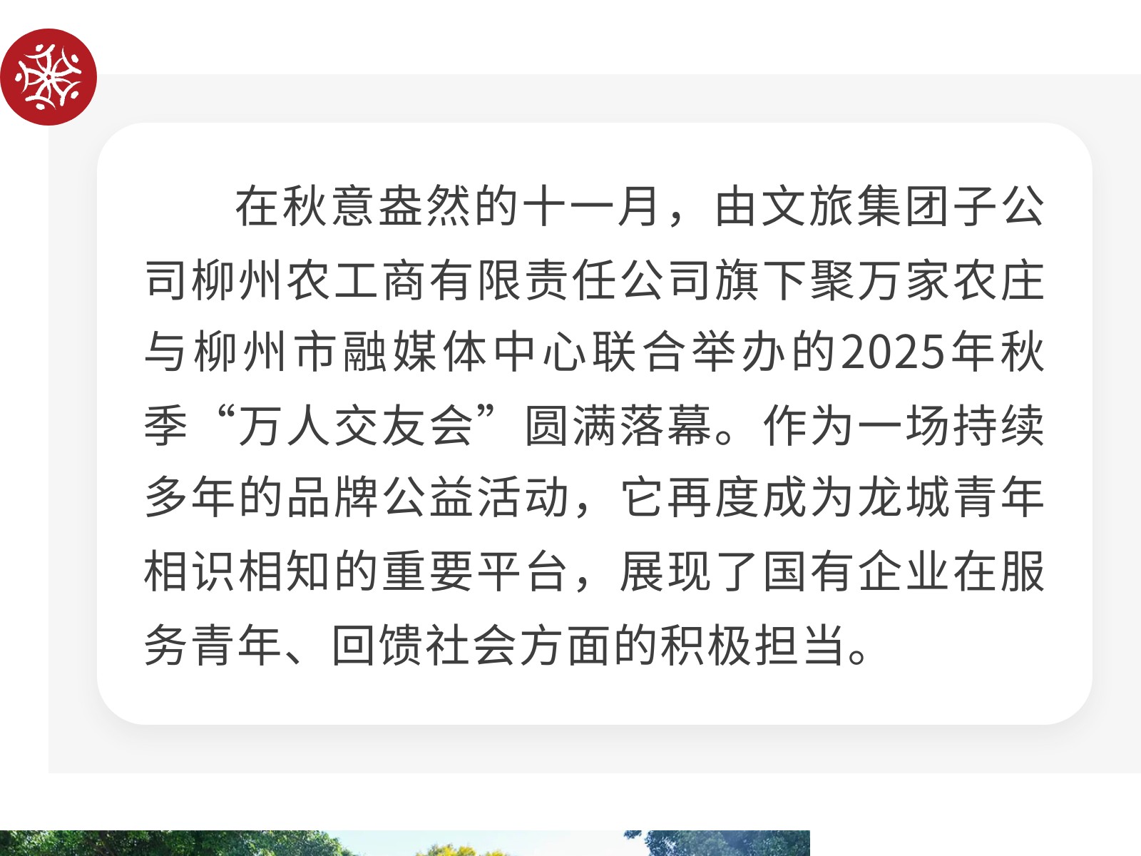 【秋日相約,情聚農(nóng)莊】柳州農(nóng)工商公司攜手打造萬人交友公益盛會 發(fā)布時間:2025年11月25日 16時來源:本站原創(chuàng)瀏覽:18 人次