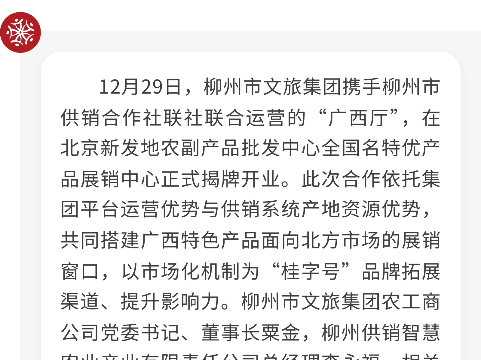 文旅集團(tuán)北京新發(fā)地廣西廳隆重揭牌開業(yè)——打造桂品入京新窗口 助力區(qū)域經(jīng)濟(jì)協(xié)同發(fā)展 發(fā)布時(shí)間:2025年12月30日 11時(shí)來源:本站原創(chuàng)瀏覽:33 人次