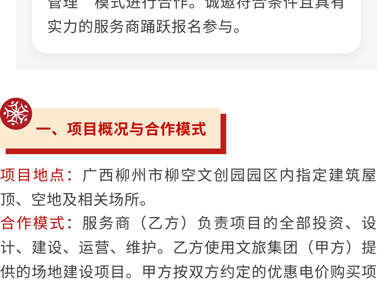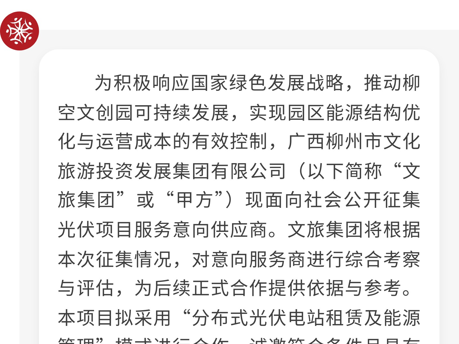 廣西柳州市文化旅游投資發(fā)展集團(tuán)有限公司關(guān)于為柳空文創(chuàng)園公開(kāi)招募光伏項(xiàng)目意向服務(wù)商的公告 發(fā)布時(shí)間:2026年01月22日 12時(shí)來(lái)源:本站原創(chuàng)瀏覽:11 人次