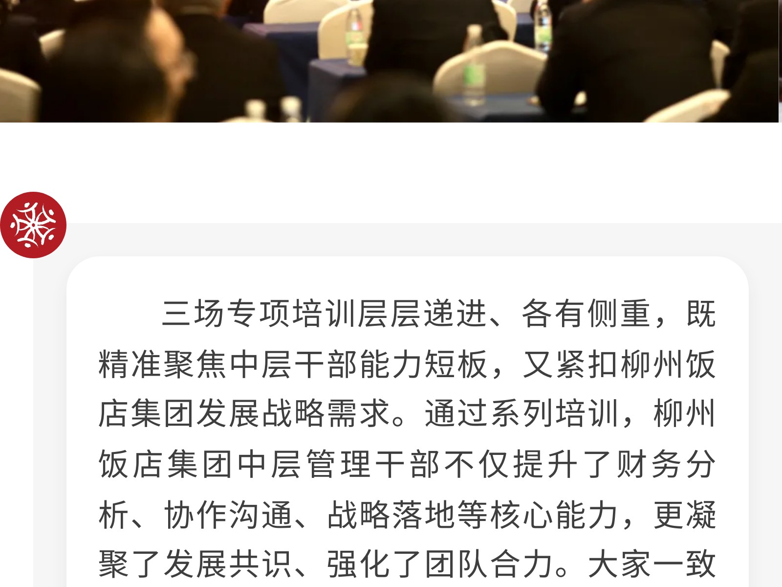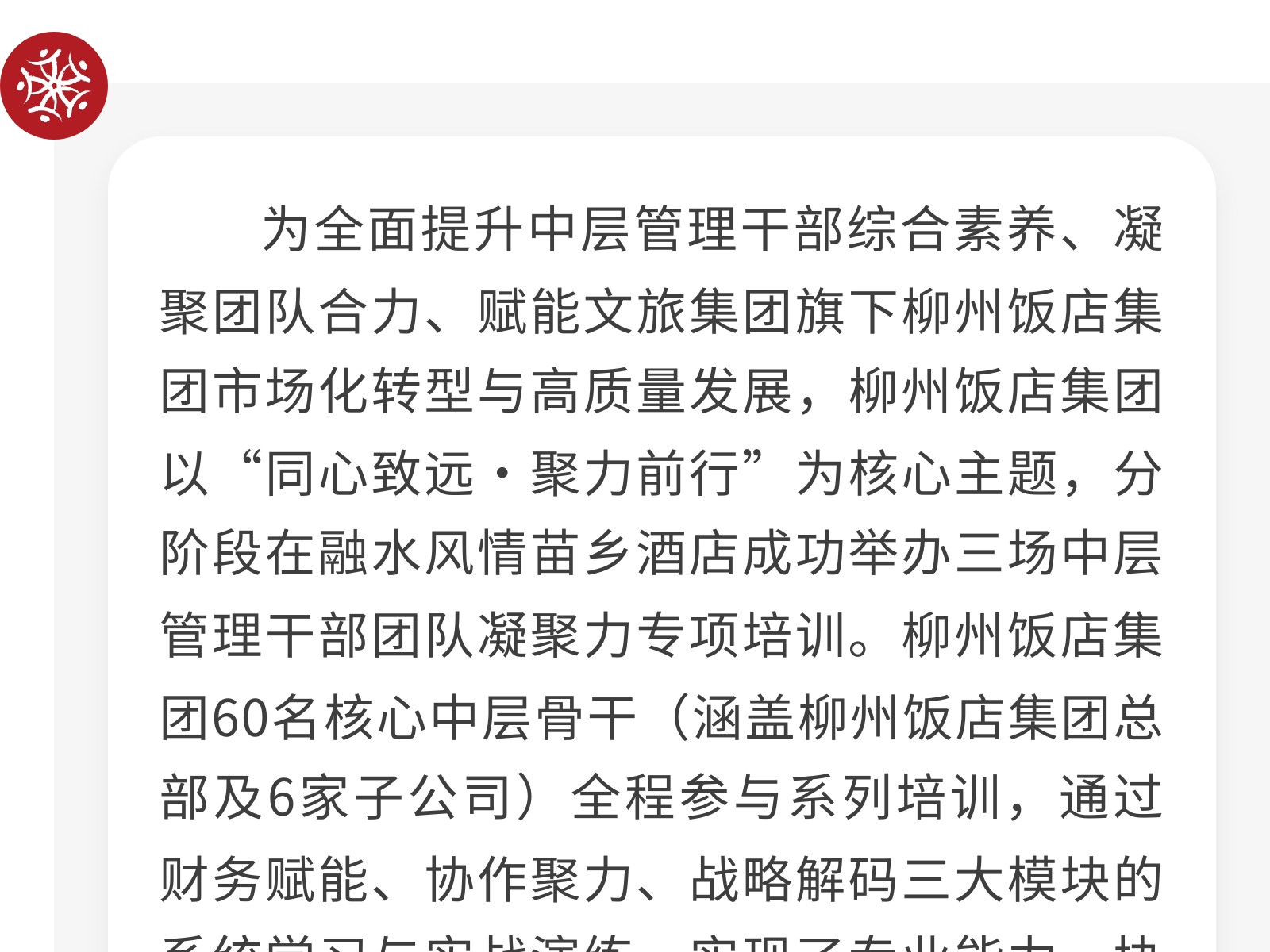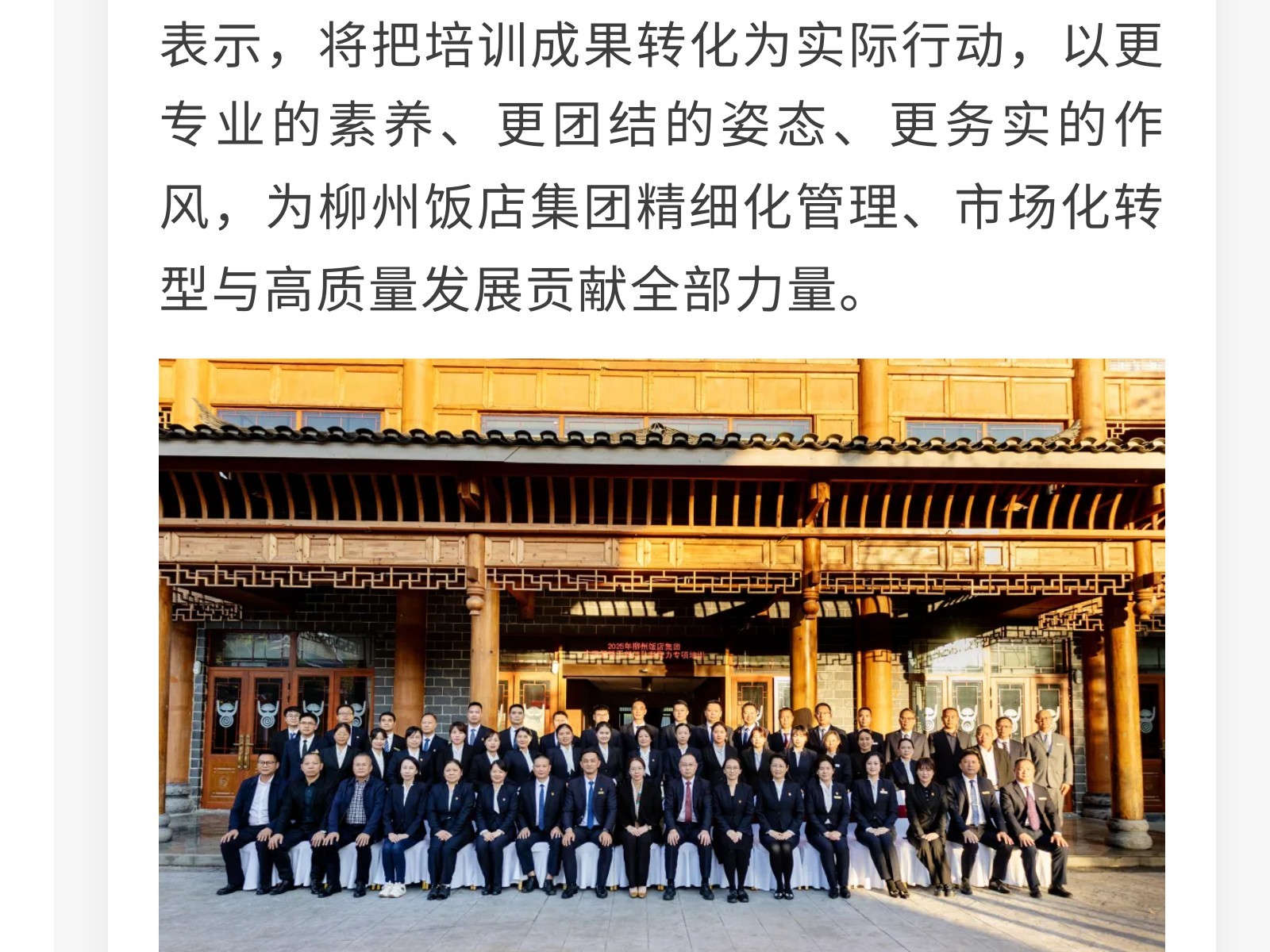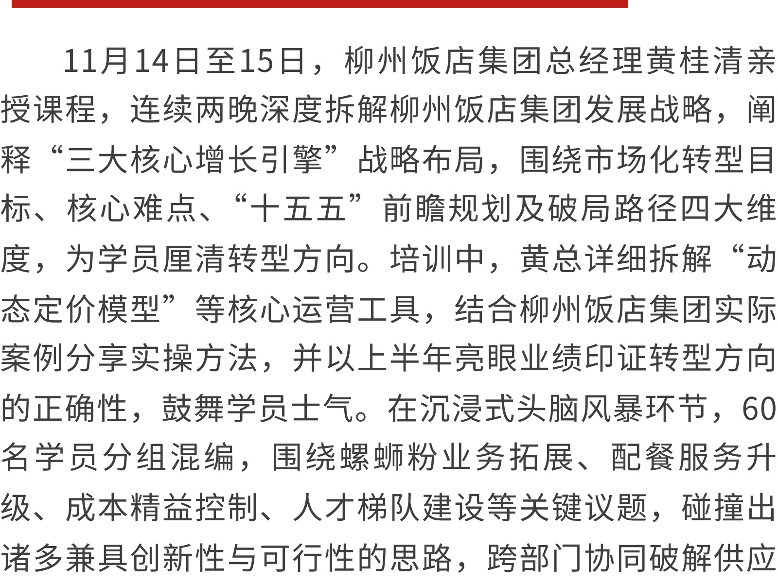 【同心致遠(yuǎn),聚力前行】柳州飯店集團(tuán)中層管理干部團(tuán)隊(duì)凝聚力系列專項(xiàng)培訓(xùn)圓滿收官 發(fā)布時(shí)間:2025年12月01日 09時(shí)來源:本站原創(chuàng)瀏覽:3 人次