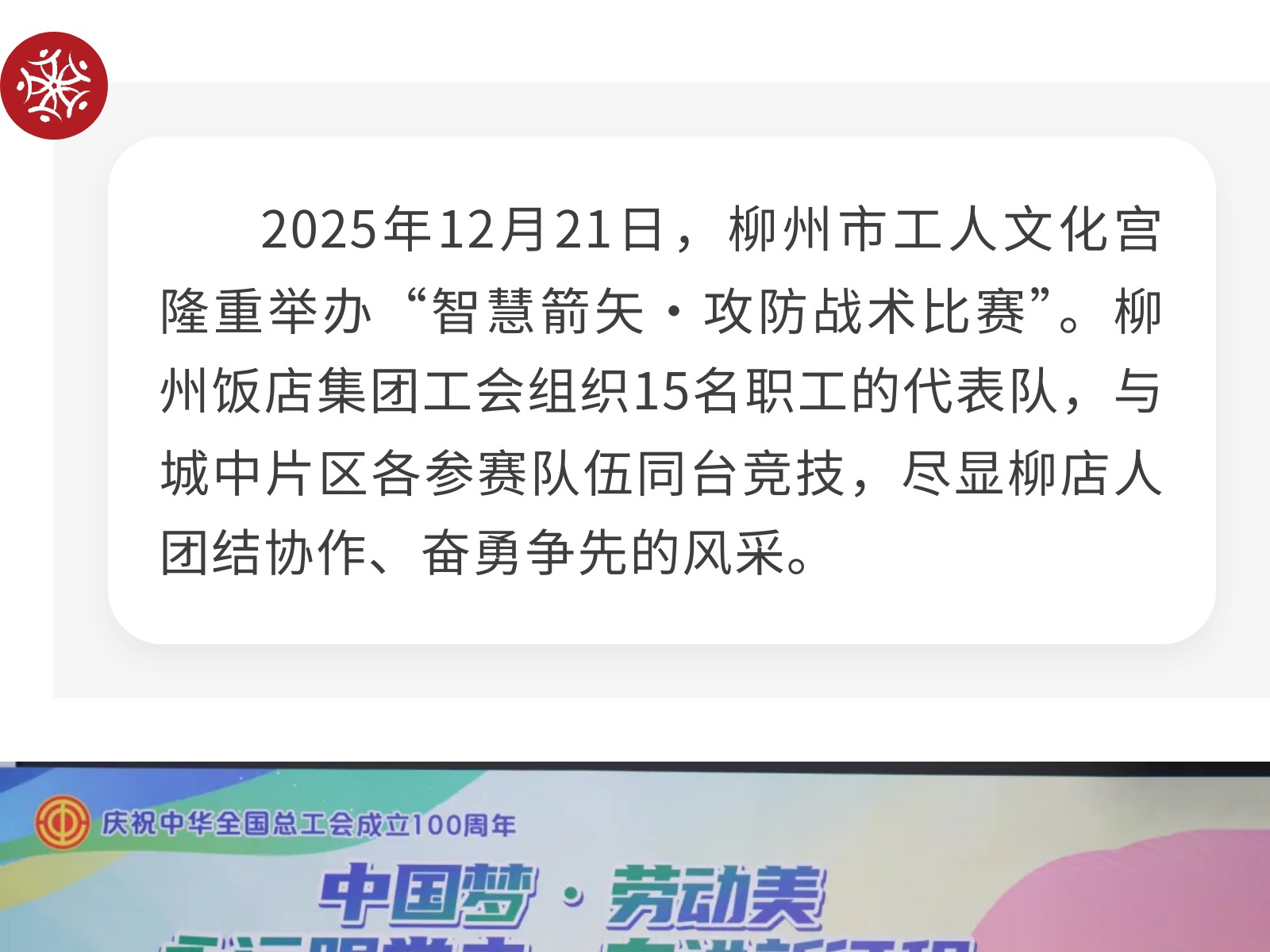 智慧箭矢,誰(shuí)與爭(zhēng)鋒!——柳州飯店集團(tuán)工會(huì)戰(zhàn)隊(duì)閃耀城中職工文化活動(dòng)賽場(chǎng) 發(fā)布時(shí)間:2025年12月30日 11時(shí)來(lái)源:本站原創(chuàng)瀏覽:3 人次