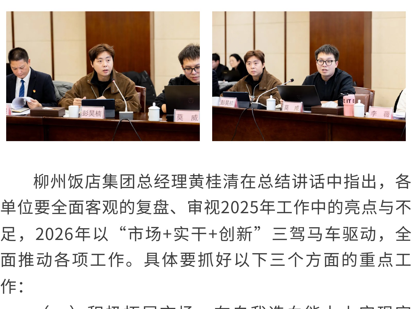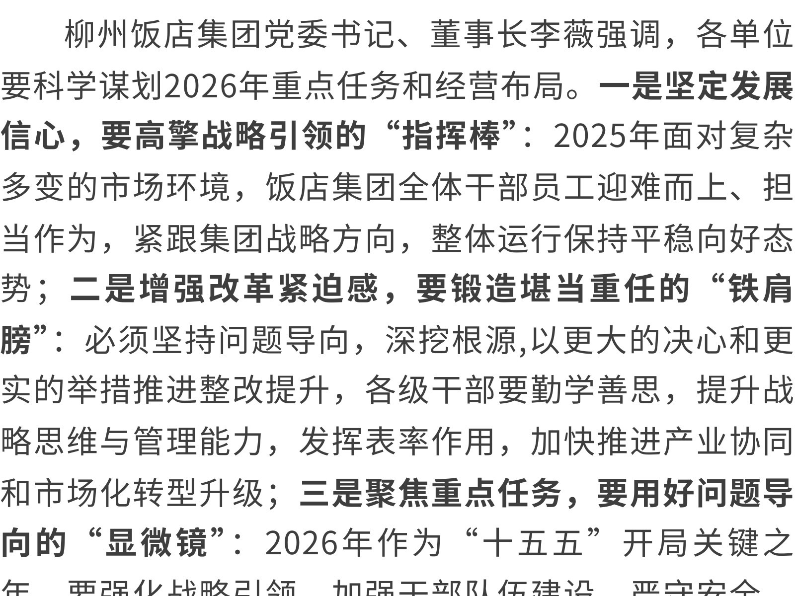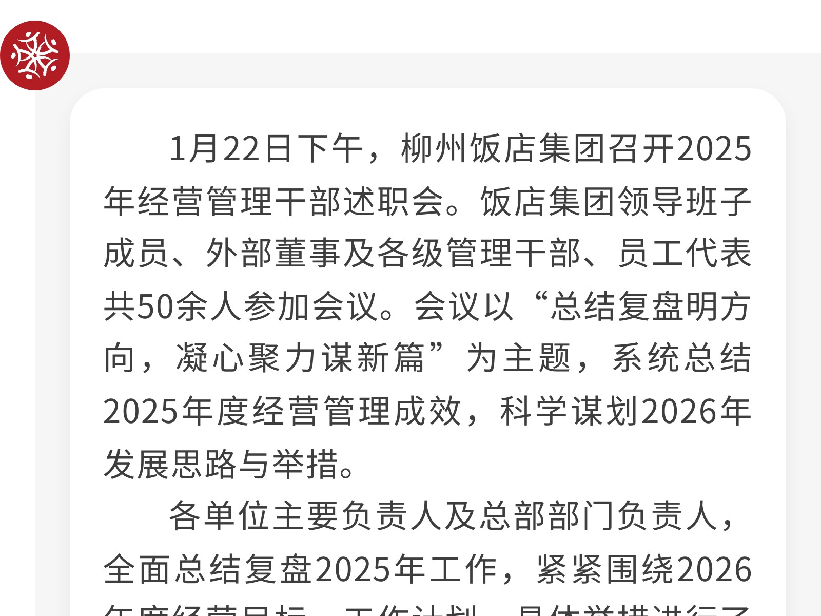 述職亮答卷,乘勢(shì)開(kāi)新局——柳州飯店集團(tuán)召開(kāi)2025年經(jīng)營(yíng)管理干部述職會(huì) 發(fā)布時(shí)間:2026年01月29日 10時(shí)來(lái)源:本站原創(chuàng)瀏覽:3 人次