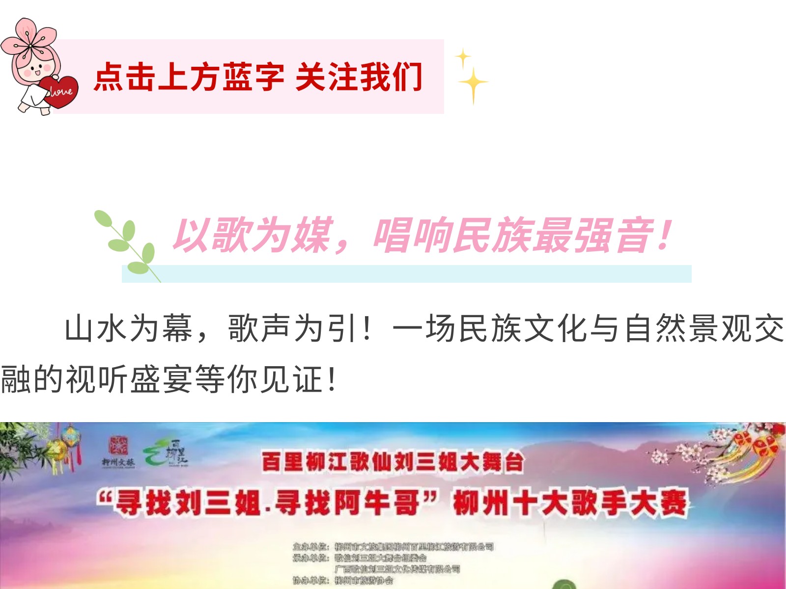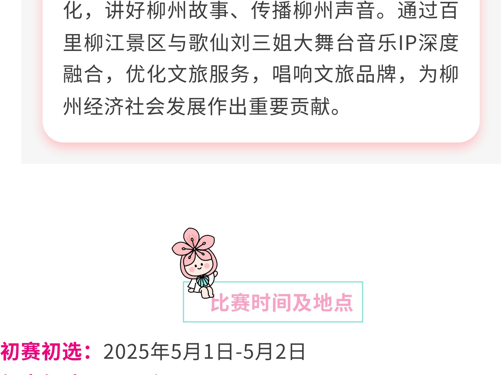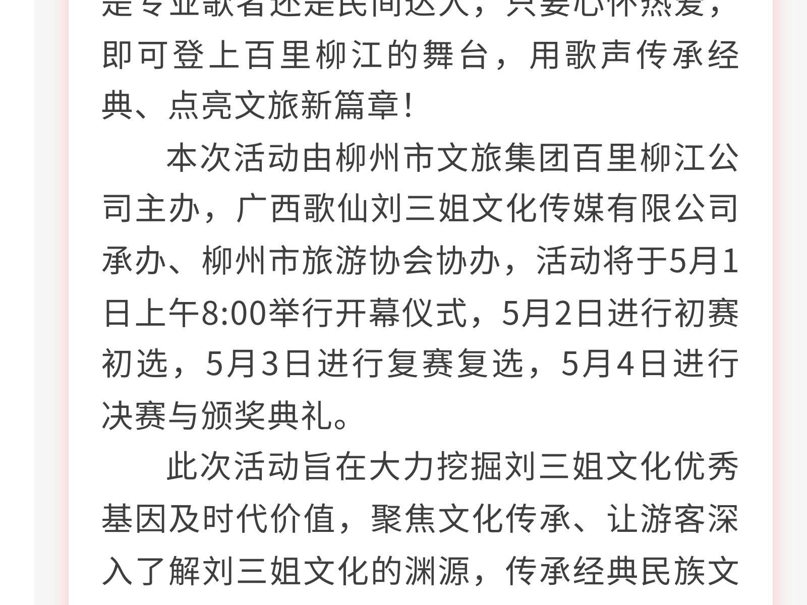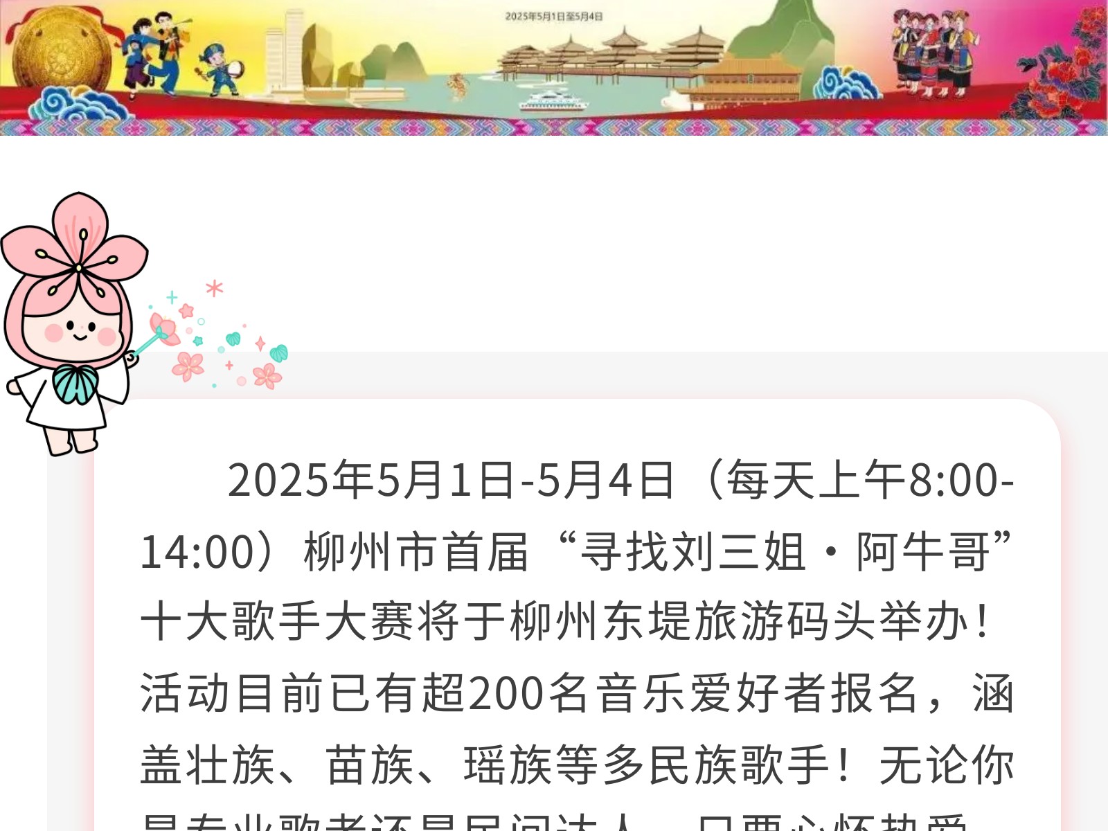 百里柳江歌仙劉三姐大舞臺等你來(lái)唱——柳州市首屆十大歌手大賽五一啟幕 發(fā)布時(shí)間:2025年04月27日 16時(shí)來(lái)源:本站原創(chuàng )瀏覽:96 人次